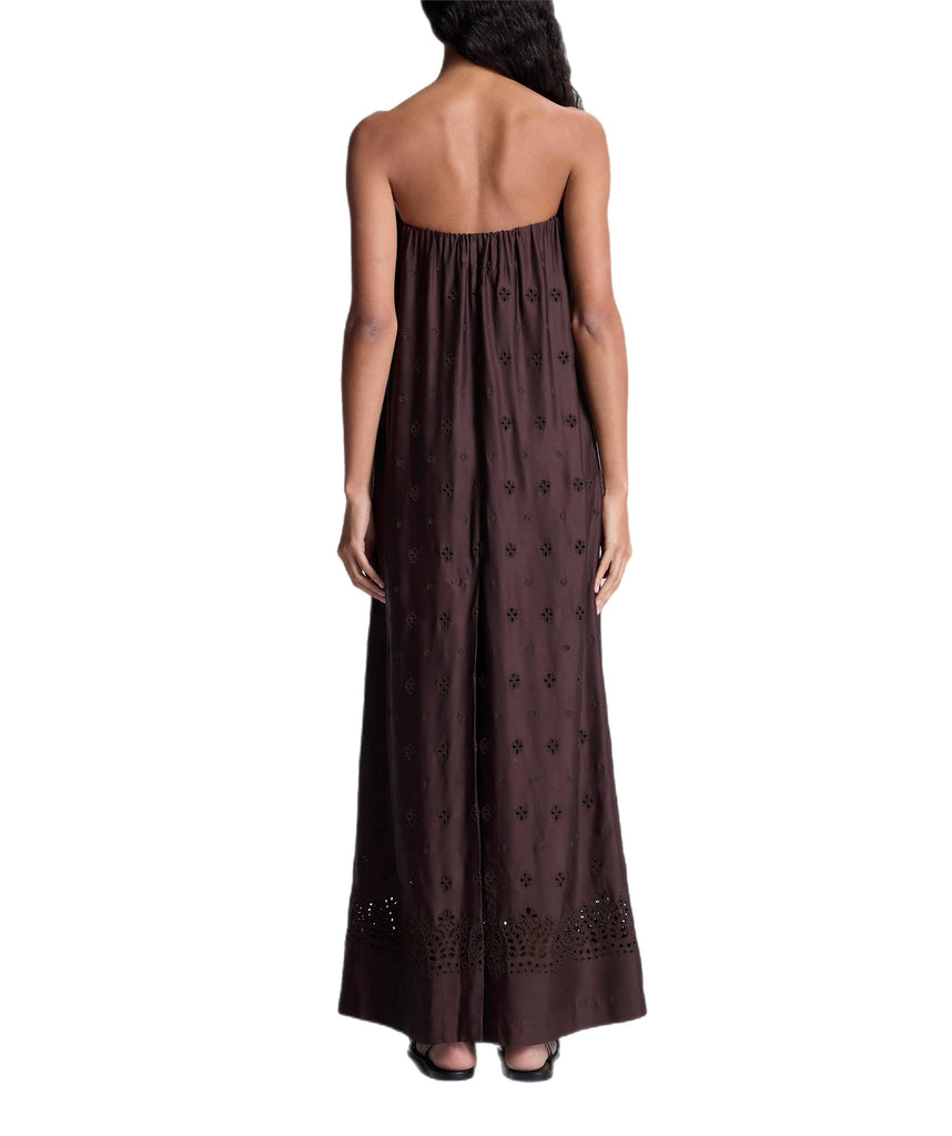 The Dahlia Dress is crafted from 100% viscose satin in a rich ganache hue, detailed with tonal bandana-inspired embroidery and eyelets throughout.  The strapless column silhouette falls straight through the body, finishing in a wide scalloped hem that adds subtle structure and volume.  100% Viscose Color: Ganache