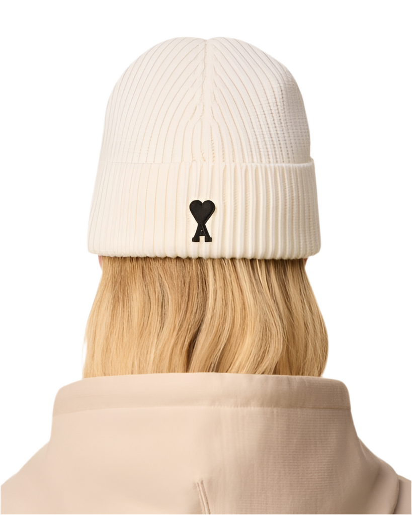 Beanie in felted merino wool knit. Unisex product with ribbed stitch and Ami de Coeur patch. Made in Italy.