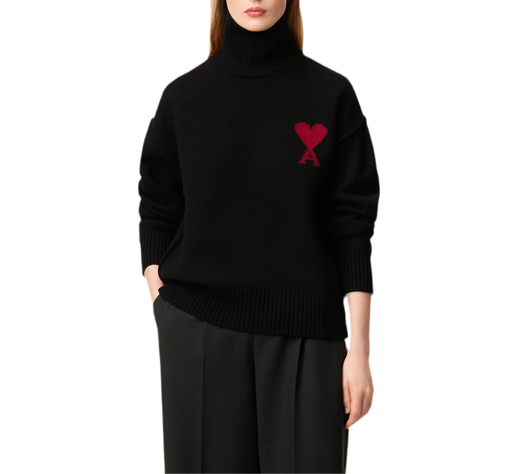 Sweater in felted merino wool knit. Unisex product with funnel neck, intarsia knitted Ami de Coeur on the chest, jersey stitch, and inside out seams.