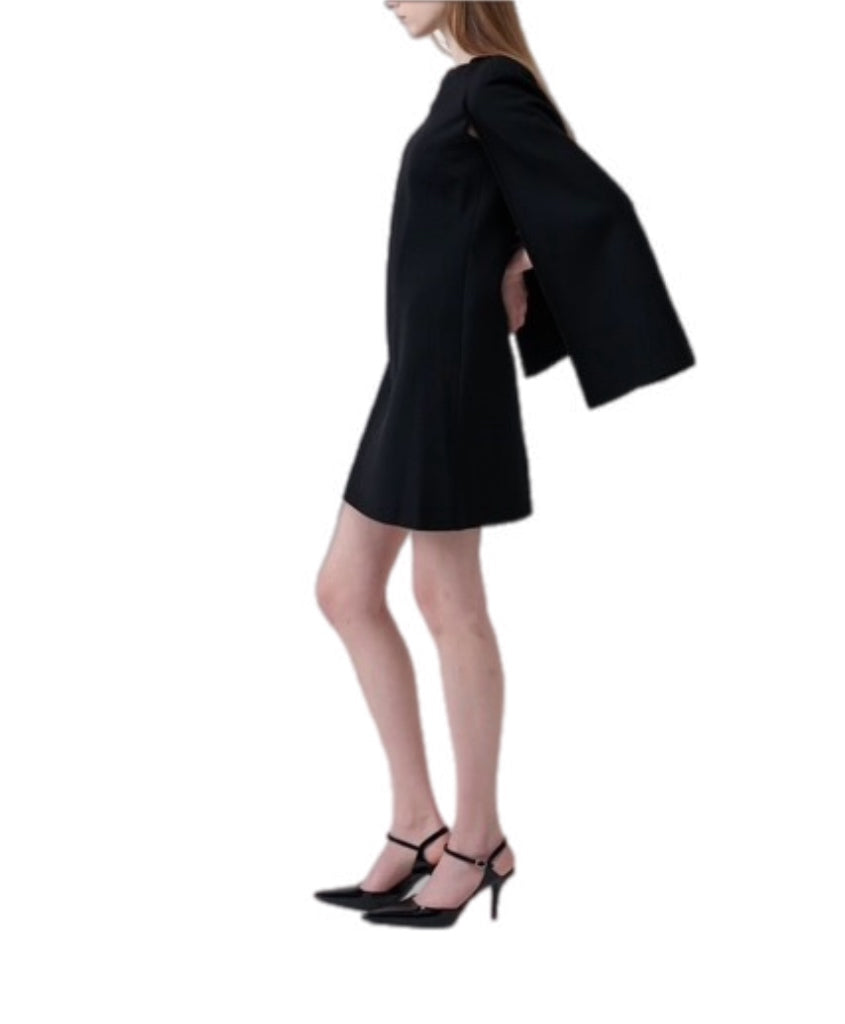 Crepe knit A-line cape dress. Rayon 35%, Polyester 26%, Wool 22%, Acrylic 13%, Nylon 4% Color: Black