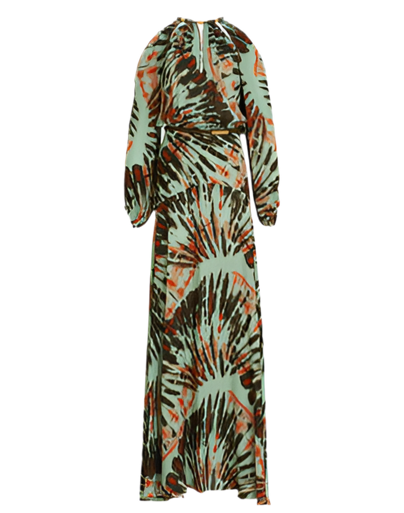 Maxi dress in Italian fabric with 3D cord with gold embellishments at the neckline. Back closure with broach, keyhole neckline, exposed shoulders and billowing sleeves, and slightly exposed back. Viscose 100% Color: Mint Tie Dye