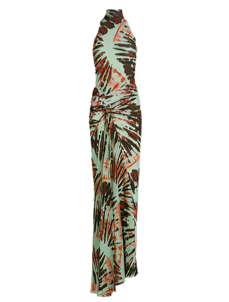 Maxi dress with fitted bodice and high neckline with zipper at the back. Polyester 50%, Viscose 43%, Elastane 7%. Color: Mint Tie Dye.